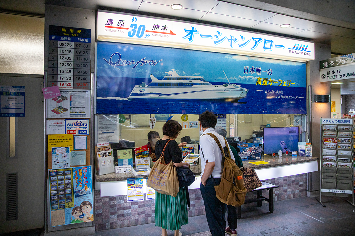 그래서 사쿠라마치 터미널 2층 유인 창구에서 버스 왕복, 페리 왕복이 포함되어 있는 티켓(3,300엔)을 구매할 수 있다. 별도로 요금을 지불한다면 총 4,220엔이 발생하니 패스를 구매하는 것이 1,000엔 가까이 이득이라 무조건 구매하는 것이 좋다. 사쿠라마치 터미널 3번 승강장에서 구마모토항까지 가는 버스를 탑승 할 수 있다.