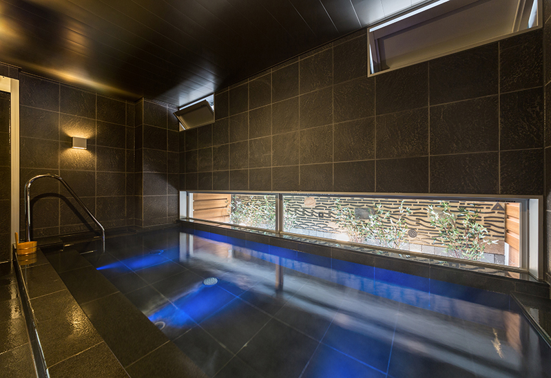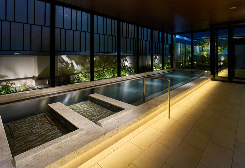 실내 욕조는 마치 일본 전통 가옥의 기와 지붕을 연상시키는 타일로 꾸며져 있어, 세련된 일본식 모던 감각을 느낄 수 있다. 침탕에서는 격자 창을 통해 보이는 계절별 정원을 감상하며 편안히 몸을 누일 수 있다.