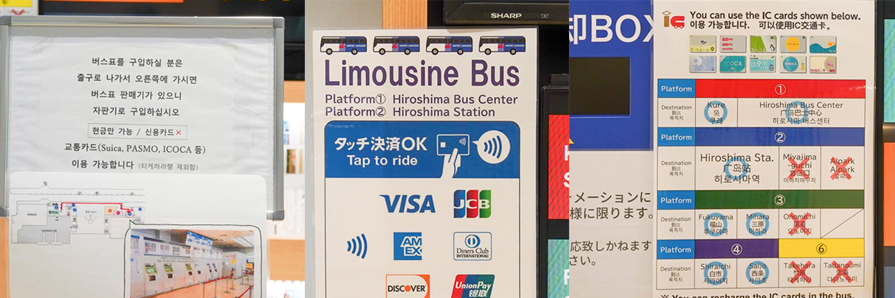 히로시마 공항은 작아 헤맬 걱정도 없고 대부분의 관광객 목적지가 비슷하기 때문에 사람 많이 가는 곳으로 따라가면 된다. 공항에서 시내까지는 리무진 버스를 이용하며 국내선 도착층에서 출발한다.