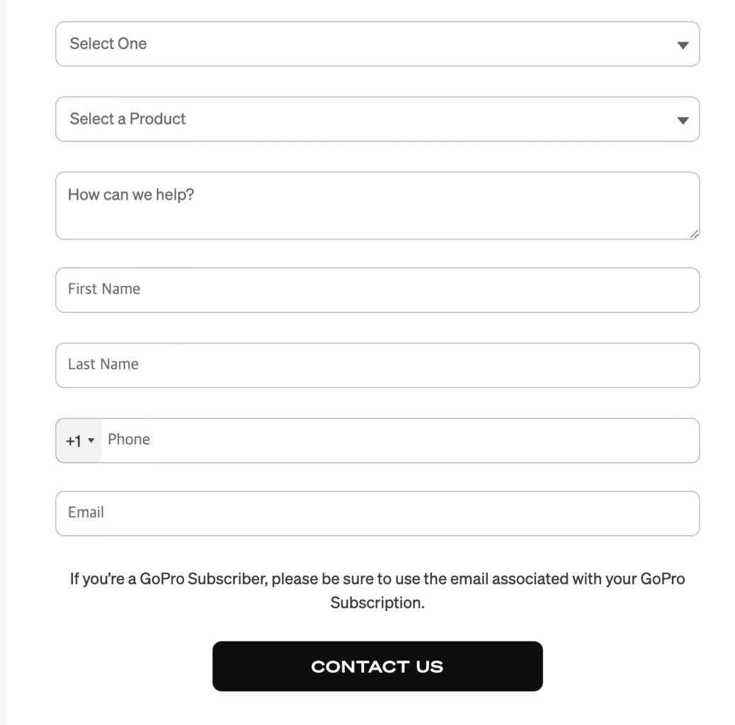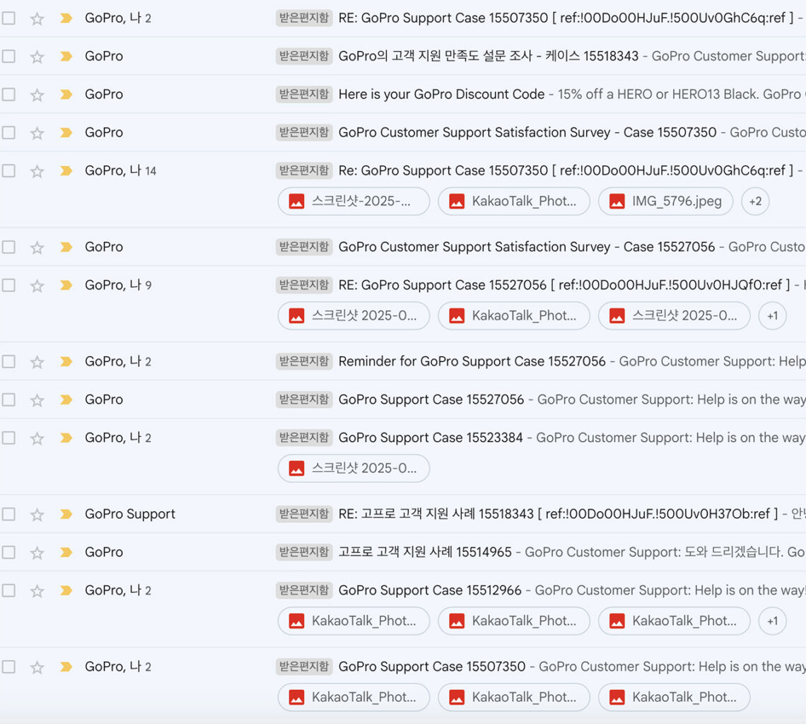 고프로 교환을 위해 블로그 후기를 찾아보면 공홈에 들어가 문의(바로가기)를 남기면 영업 시간 내에는 채팅이나 전화로 상담 받을 수 있다고 되어 있는데 내가 고프로 교환을 위해 접속한 2025년 4월에는 채팅과 전화 모두 불가능하게 변경 되었다. 현재는 이메일로 문의 후 고프로 교환을 진행해야 한다.